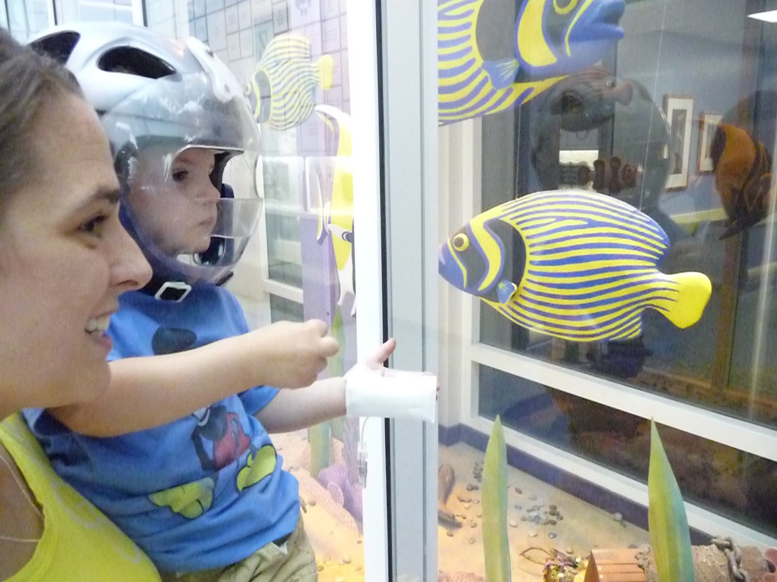 | Even though Ben didn't fully recover from his noon time IV drama until about 5:00 p.m. (every time he would look at his hand he would start crying and every little movement seemed to set him off...anyone that came in to do anything he didn't want to let them touch him) one thing that did distract him for a little bit was the moving fish down on the first floor by the elevator. While we were up in the room he kept signing "fish" to Andy to get him to take him down. He got a few trips out of him :) |